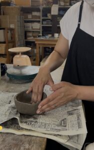 陶土をこねて平らに伸ばし、形を整えていきます。